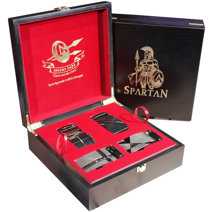 • Luxusná kazeta: pevná drevená kazeta s červeným polstrovaním, doplnená reliéfnym logom Spartan brave warrior, ideálna na vystavenie alebo darovanie.